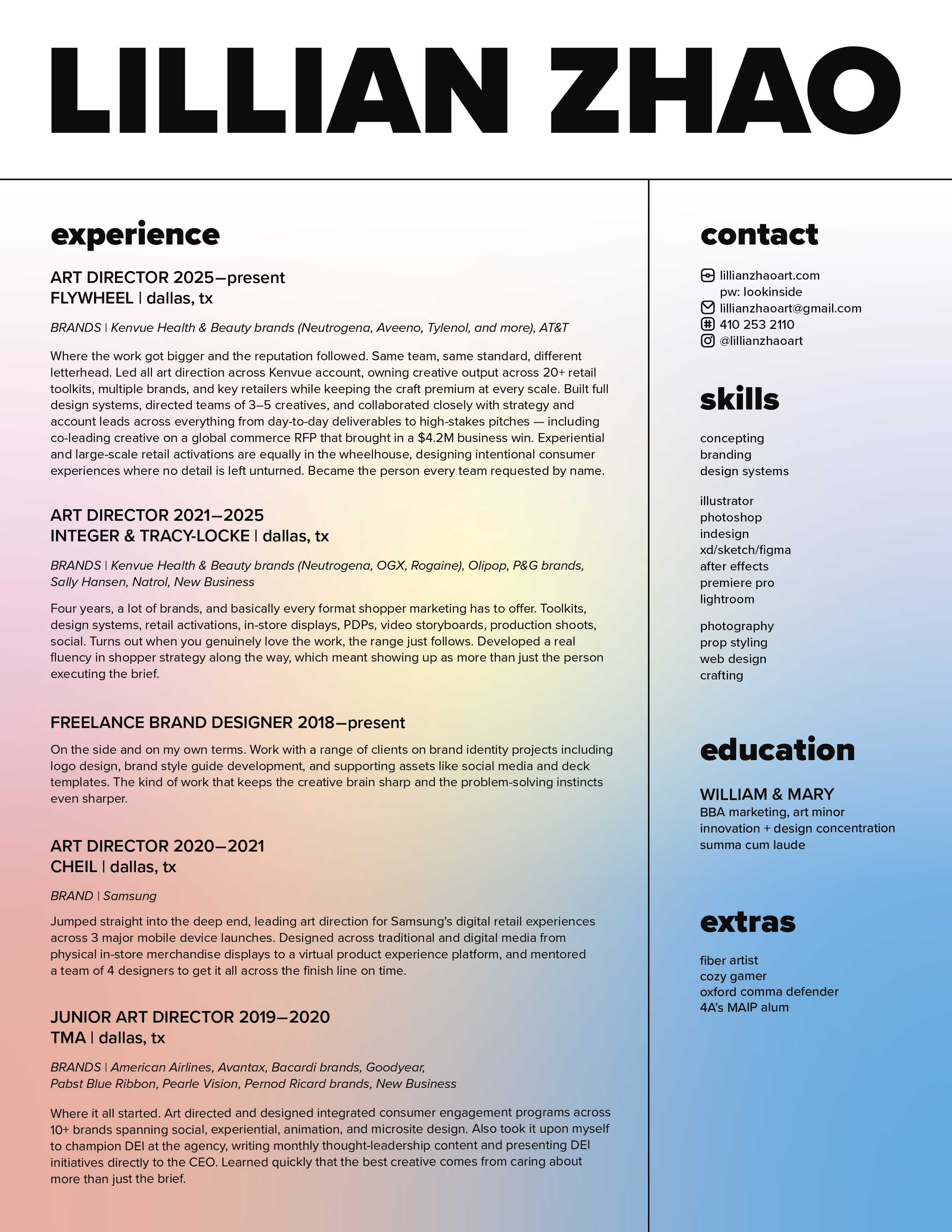 Lillian is a Dallas-based art director bringing ideas to life at Flywheel. With a background rich in CPG work for brands like Kenvue and P&G—spanning beauty and personal care to beverages and household essentials—she brings strategic creative thinking across diverse categories. Beyond her agency work, Lillian partners with clients to build brands from concept to execution—developing logos, brand books, and comprehensive design systems.